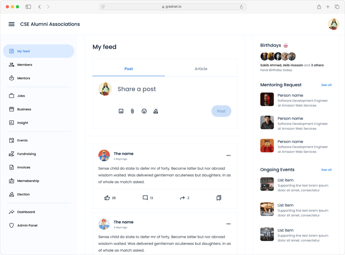 A professional private network to manage membership, event & fundraising. With Gradnet, streamline outreach, boost donations, manage memberships, and run impactful events—all in one place.