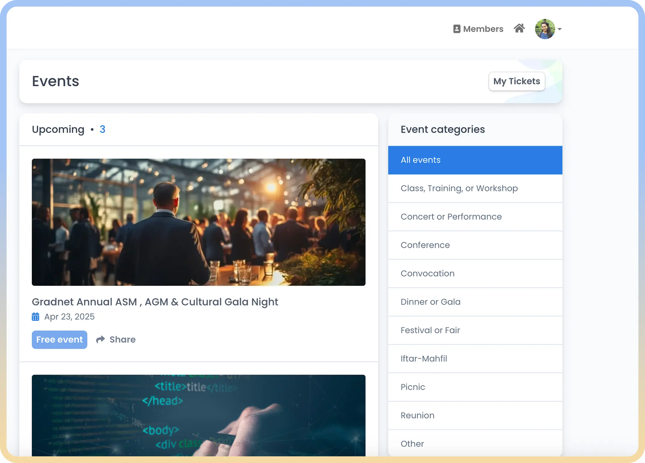 Gradnet’s event management tool makes it easy to organize any type of event, whether it’s a small get together or a large concert. With our user-friendly platform, you can easily manage all the details of your event and ensure that your attendees have a great experience. Plus, it let you deliver your event online, so you can reach a wider audience.